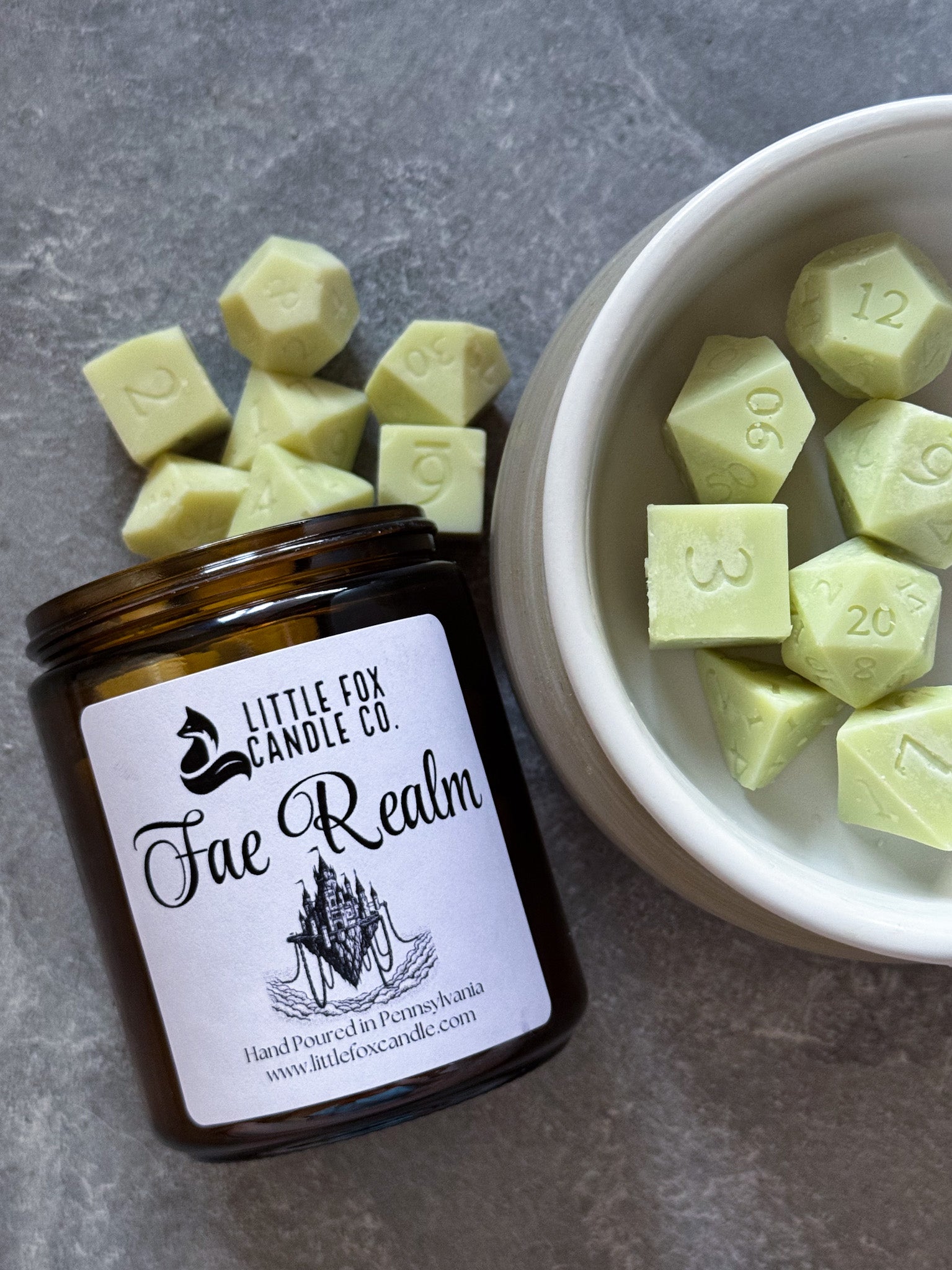 Step into a world of whimsy and wonder with the Fae Realm Wax Melt Dice Set! Infused with the delicate, ethereal scents of jasmine, honeysuckle, and soft powder, these wax melts—shaped like classic polyhedral dice—capture the essence of a mystical glade where the air hums with enchantment and unseen magic lingers in every breeze.